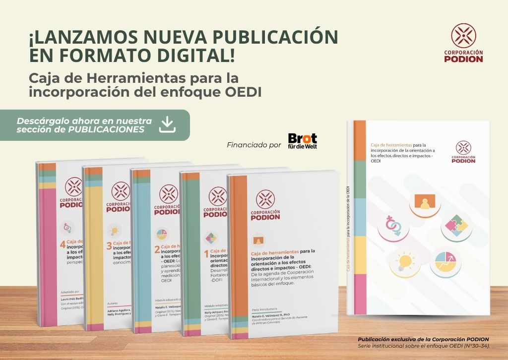 Con el propósito de fortalecer las capacidades de las organizaciones de la sociedad civil que trabajan por la transformación social, la Corporación PODION presenta la Caja de Herramientas para la Incorporación de la Orientación a los Efectos Directos e Impactos –OEDI, una publicación financiada por Brot für die Welt (Pan para el Mundo)– Servicio Protestante para el Desarrollo.