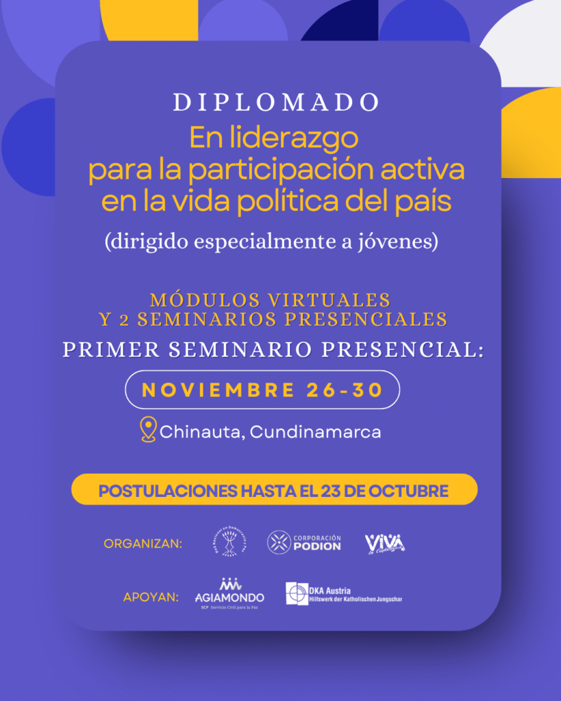 Está abierta la convocatoria al Diplomado en Liderazgos Políticos creado por la Corporación Podion y la Red Nacional en Democracia y Paz, en alianza con Viva la Ciudadanía. El diplomado está dirigido a personas (especialmente jóvenes) que ya ejercen un liderazgo social y político en su comunidad.